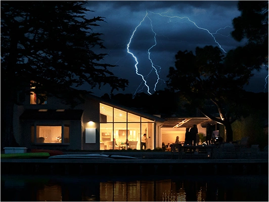Powerwallの蓄電容量は13.5kWhの大容量(一般的な4人世帯の1日分相当)、かつ高出力5kWのため、停電時にも家全体に電気を供給でき、通常通り生活することができます。さらに、200V機器(エアコンやIHクッキングヒーター等)もご使用頂けます。